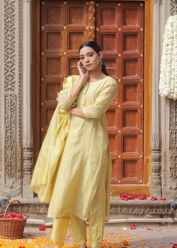 Mustard Chikankari Jute Chanderi Kurta Set | HER-160