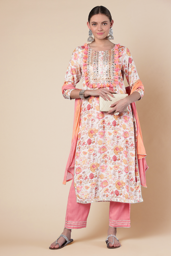 Cream Straight fit Muslin Kurta set (with Pant and Dupatta)