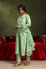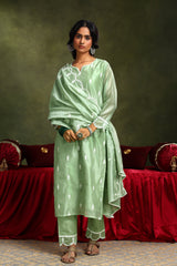 Pastel Green Hand-Embroidered Chanderi Suit Set, with Pants and Dupatta