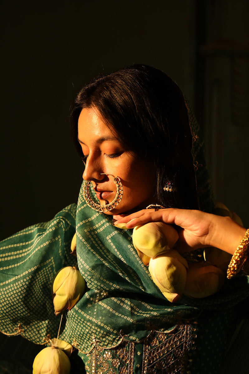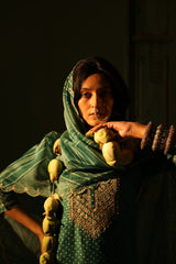 Elevate your ethnic wardrobe with our Teal Bandhani Chanderi Suit Set, a timeless blend of tradition and sophistication. Crafted in luxurious Chanderi fabric, this set features intricate white bandhani dots on a rich teal base, paired with exquisite hand embroidery around the neckline. The accompanying dupatta showcases scalloped detailing and delicate zari edging, adding a regal touch to your festive or wedding-ready look.