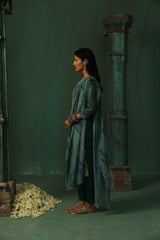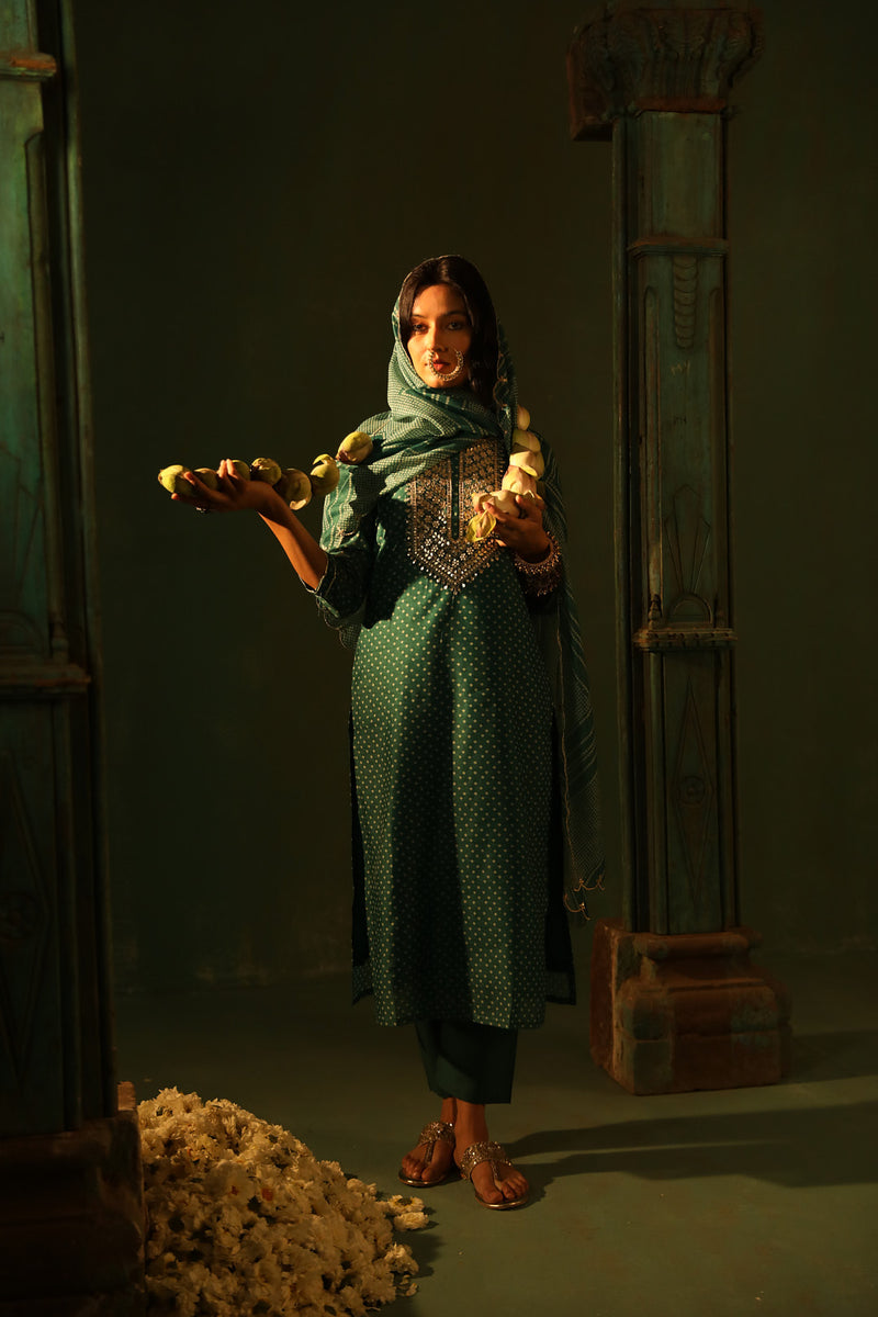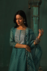 Teal Bandhani Chanderi Suit Set, with Pants and Dupatta