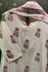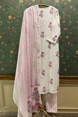 Elevate your everyday style with Floral Blush — a refreshing white cotton suit set adorned with delicate pink and purple floral motifs. The kurta features vertical woven texture lines that add subtle elegance, finished with a charming printed border. The coordinated printed dupatta and zigzag patterned trousers lend a touch of contemporary flair, making this set ideal for casual outings or warm summer days.