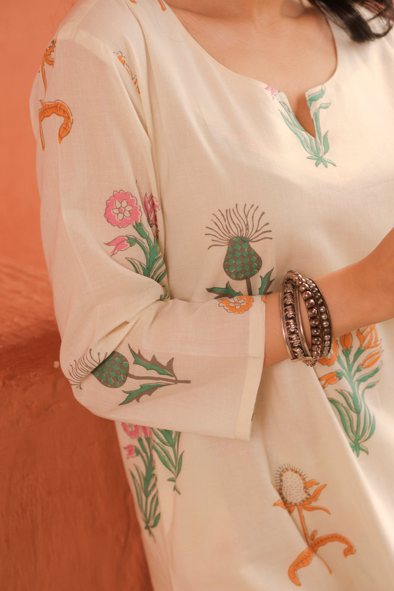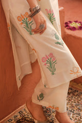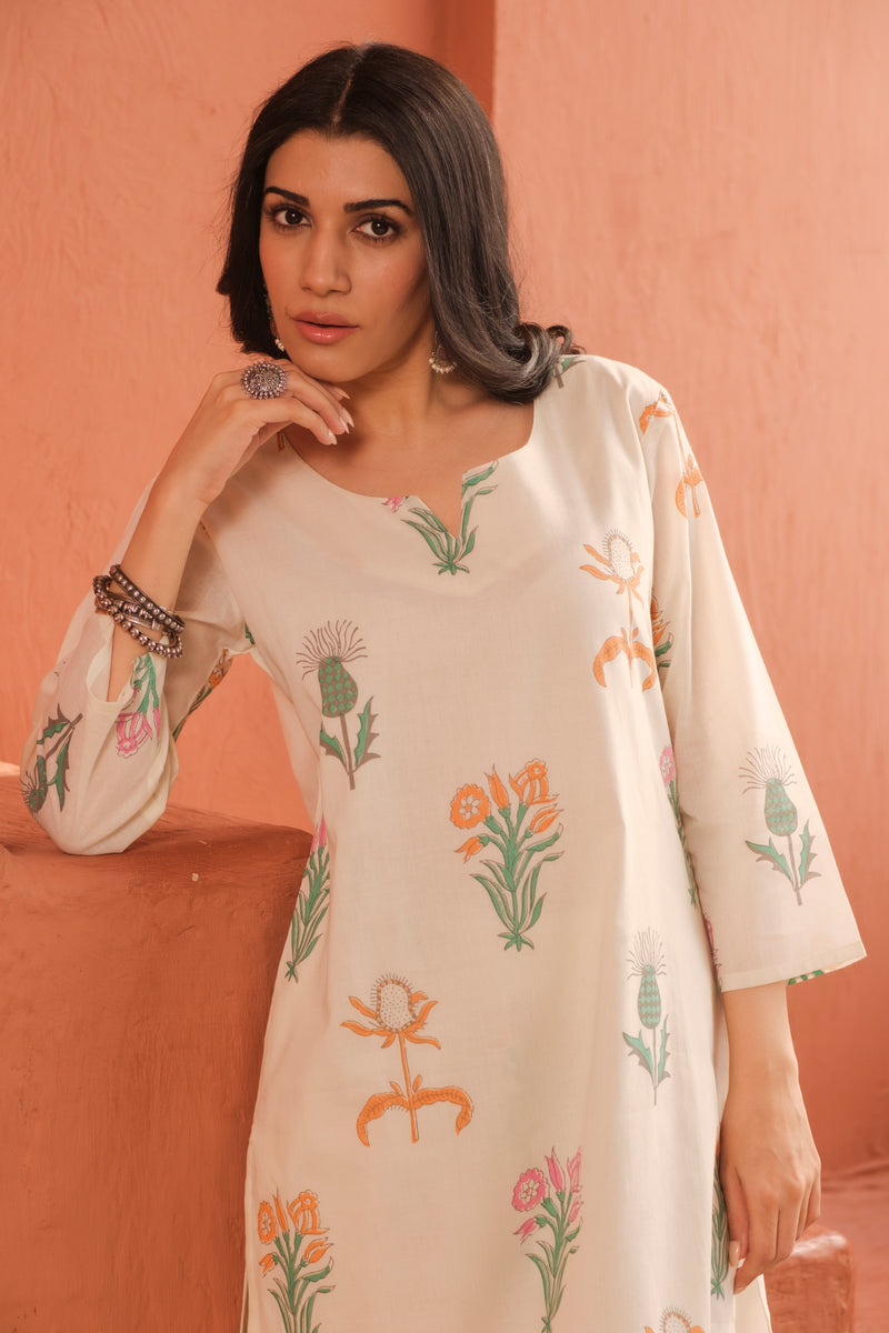 Product Description : Effortless summer elegance in every thread. This breathable cotton co-ord set features a relaxed kurta and pants adorned with charming floral motifs. A perfect blend of comfort and heritage craftsmanship.
