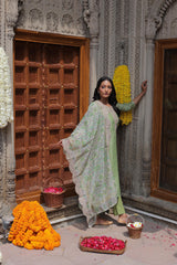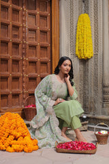Green Straight Fit Chanderi Suit Set (With Pants and Dupatta)