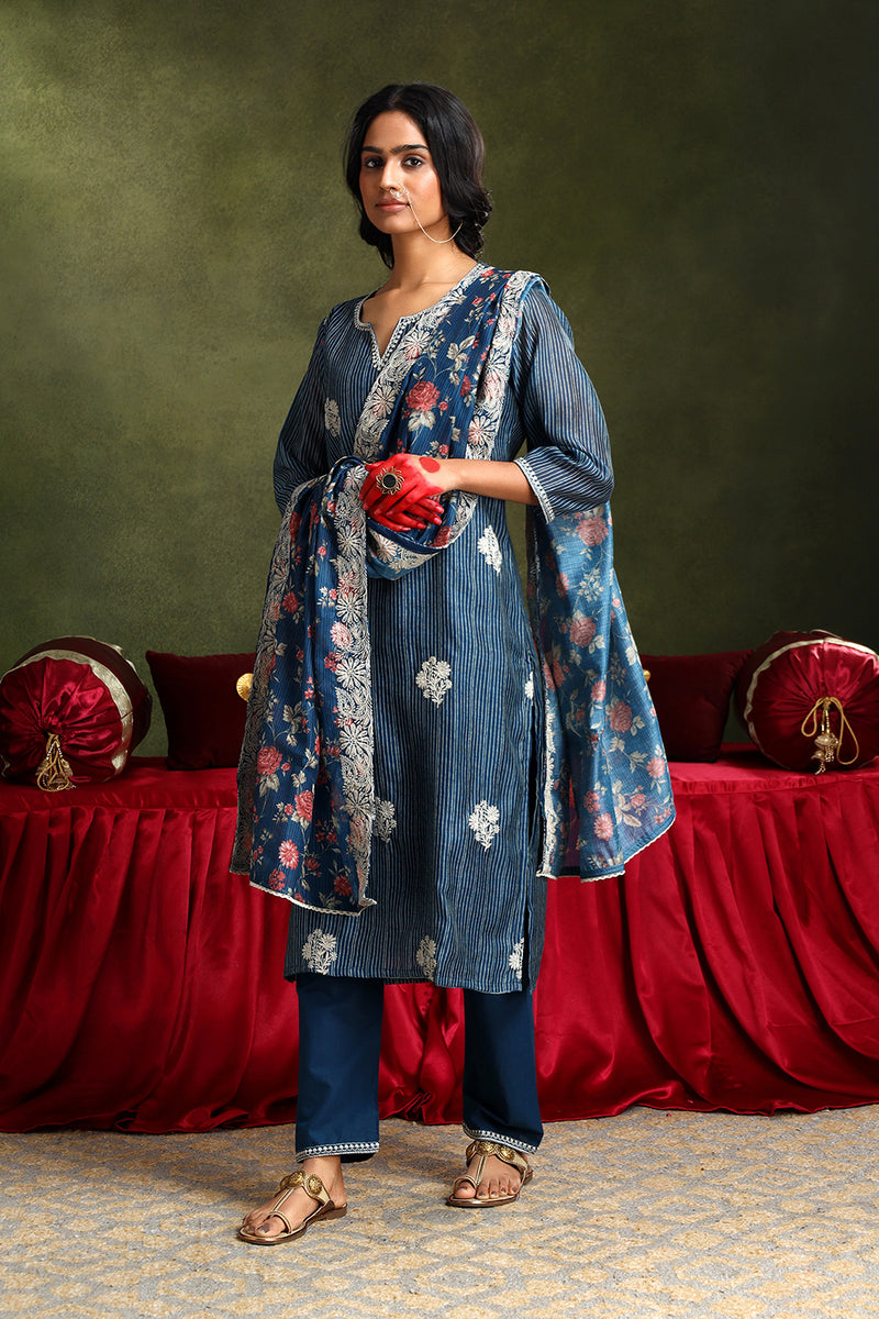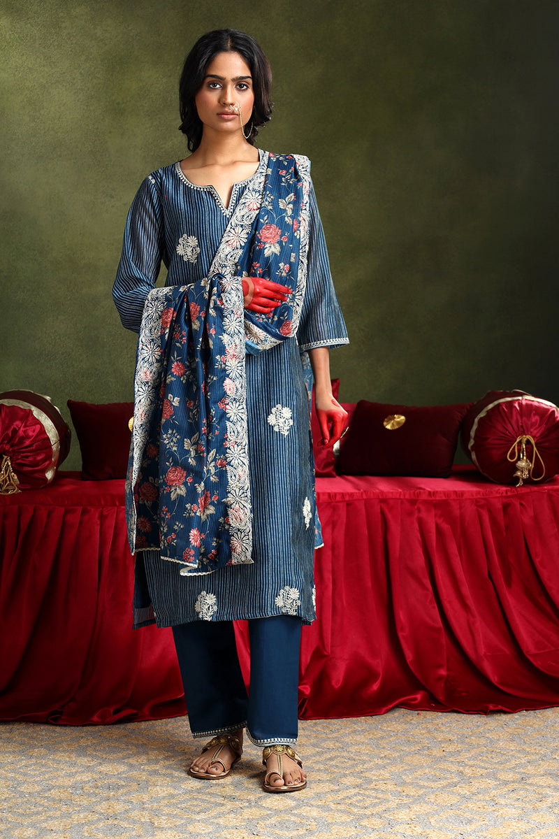 - A deep indigo kurta with vertical pinstripes and intricate white floral handblock motifs scattered throughout.
