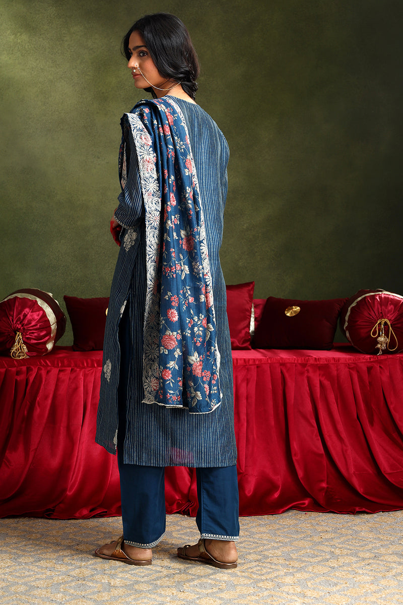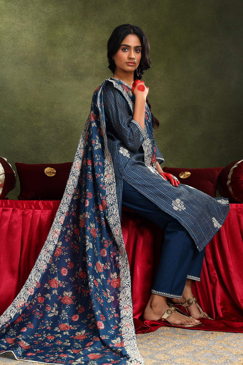 - A matching straight pant in a solid indigo hue that complements the kurta effortlessly.