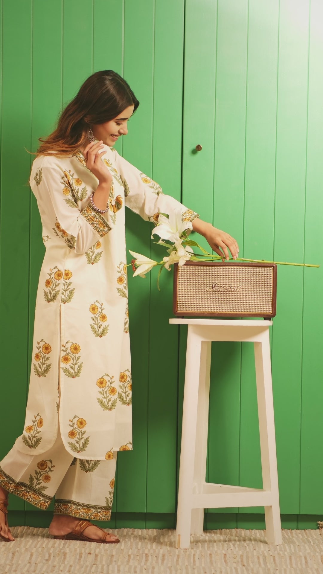 Marigold Whispers Cotton Kurta/Co-ord Set, with Pants only - Ivory base with Deep Crimson Red & Olive Green Floral Accents