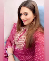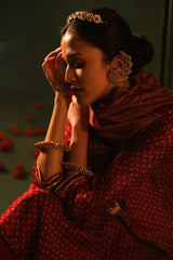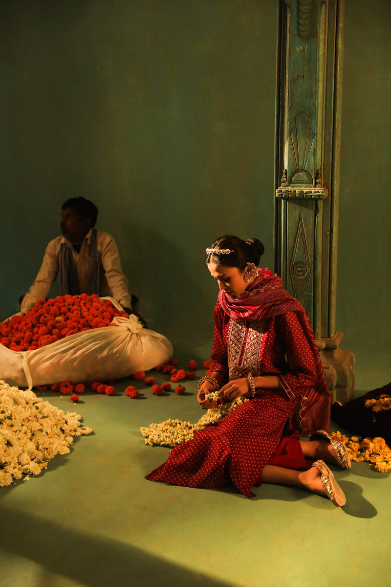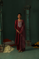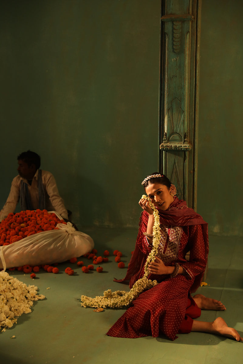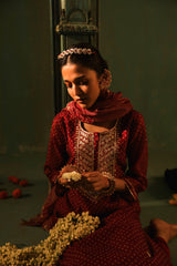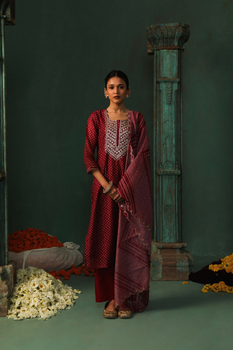 Wine Bandhani Straight Fit Chanderi Suit Set (With Pants and Dupatta)