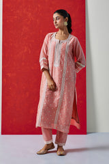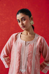 Say hello to effortless elegance with a pastel pink Chanderi suit set crafted in a breezy silhouette, this ensemble is adorned with intricate white thread embroidery along the neckline, sleeves, and dupatta—offering a subtle yet stunning festive statement. The kurta’s soft sheen, paired with delicate gota lace and tonal patterns, evokes the warmth of golden blossoms and early summer mornings. Paired with matching bottoms and a scalloped-edge dupatta, it’s perfect for festive brunches.