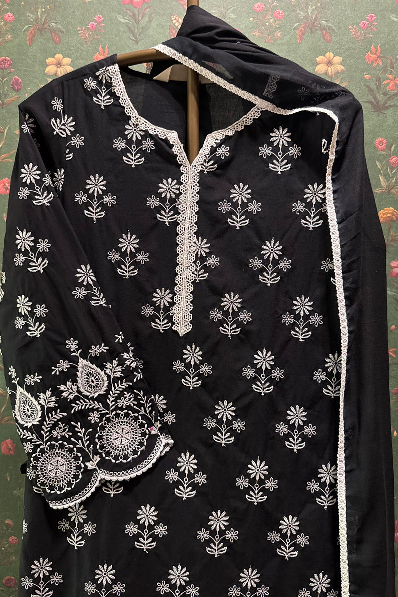 Radiate elegance in this Noir Black Suit set, crafted from breathable cotton and adorned with delicate white floral embroidery. Featuring intricate lace detailing along the neckline and a black monochrome look, this piece blends traditional charm with everyday comfort. The set includes matching pants detailed with coordinating lace trim for a cohesive, feminine touch. Completed with a lightweight dupatta edged in elegant lace, this ensemble is ideal for summer gatherings, brunches, or festive days when comfort meets charm.