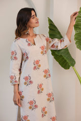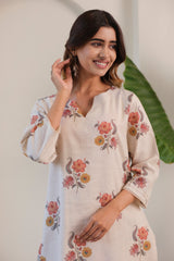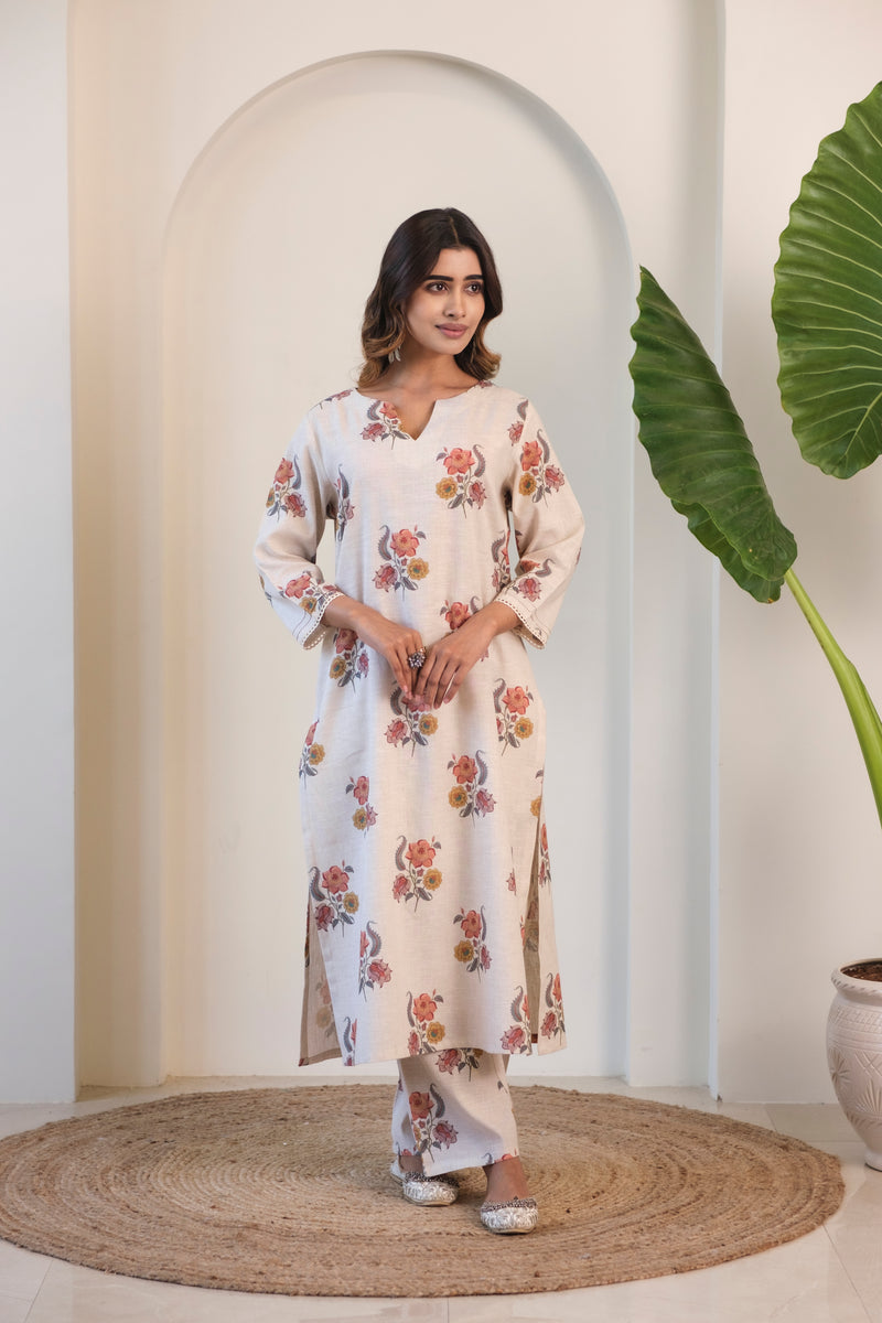 A garden in full bloom 🌸— crafted in pure linen for effortless summer elegance. Step into floral finesse with our Gulbagh Co-ord Set, tailored in breathable pure linen. Featuring a soft beige base adorned with painterly floral prints in lavender, peach, and olive hues, this set exudes timeless charm. The kurta comes in a straight silhouette with three-quarter sleeves, delicate lace detailing at the cuffs, and comfortable side slits. Coordinated floral trousers complete the co-ord look, perfect for easy days and elevated evenings.