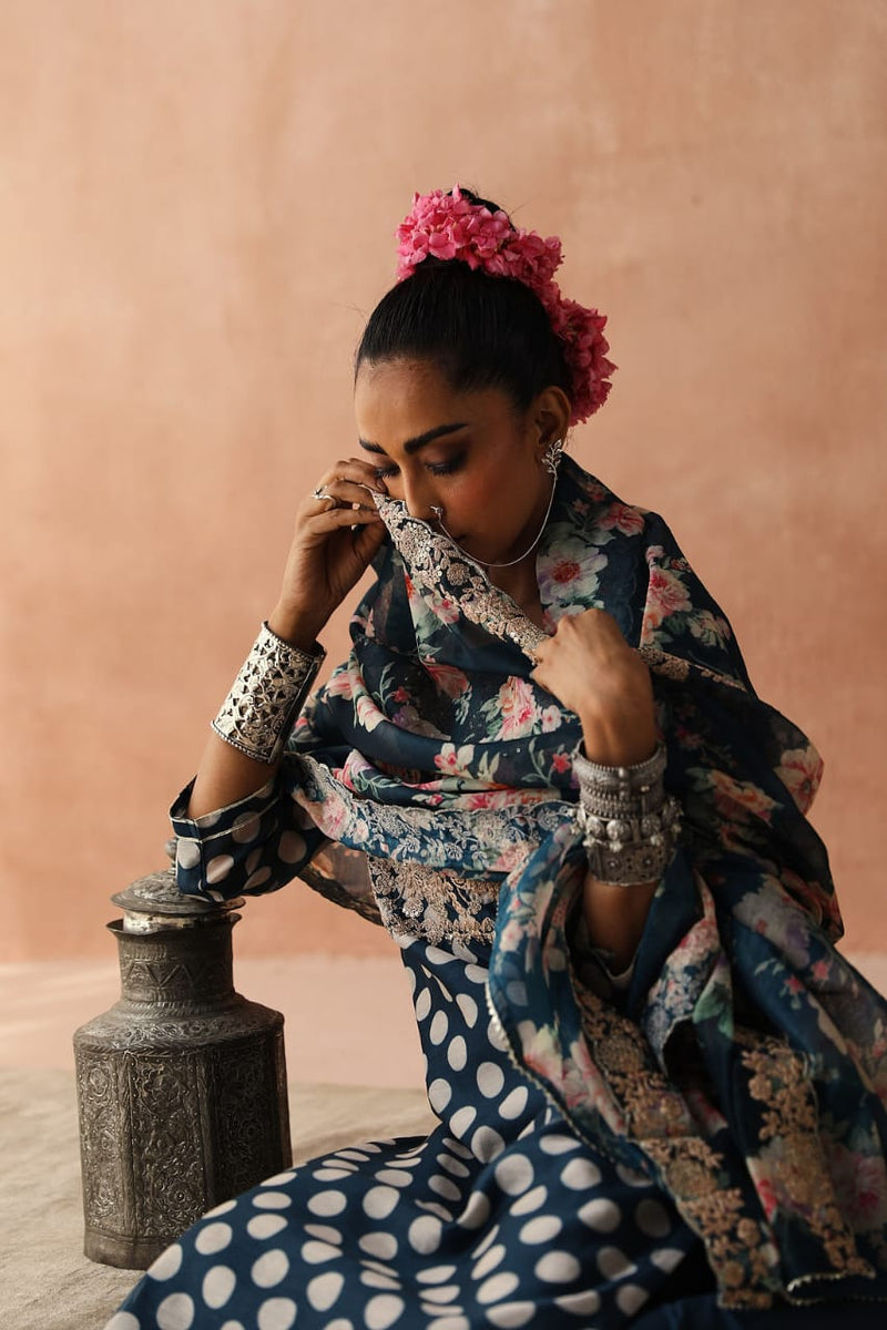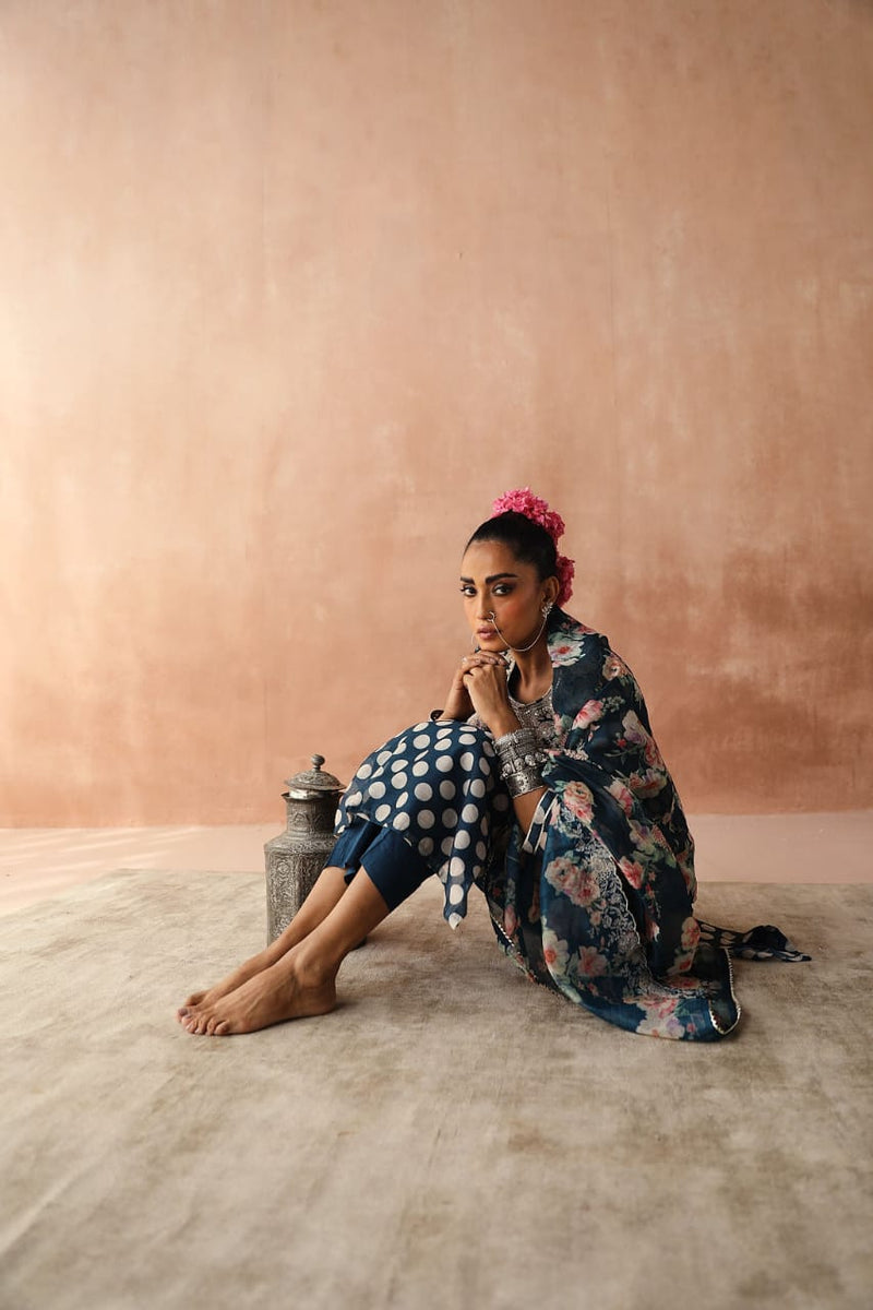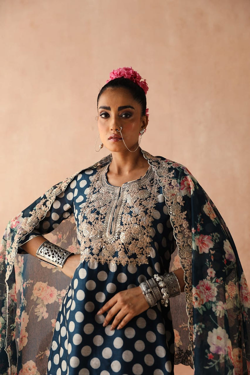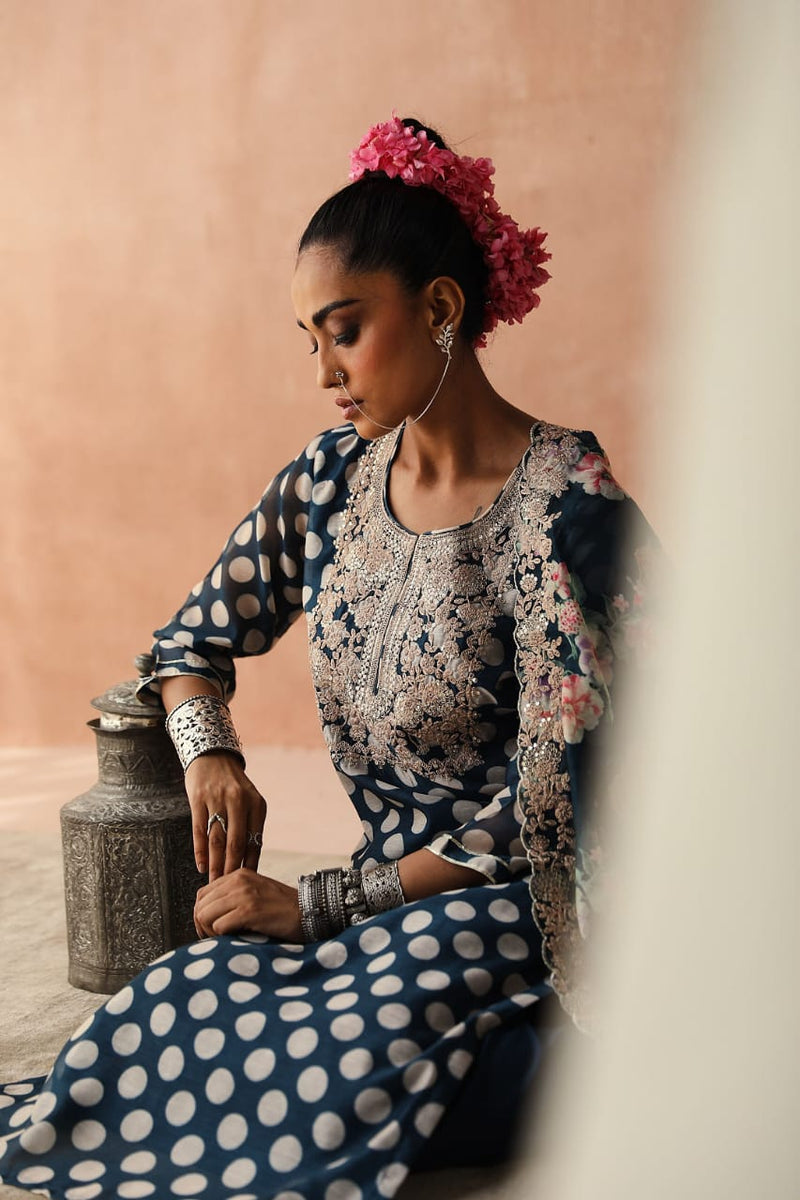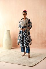 Big Polka Dot Blue Straight fit Chanderi Kurta set