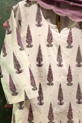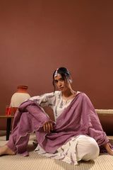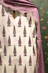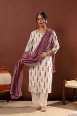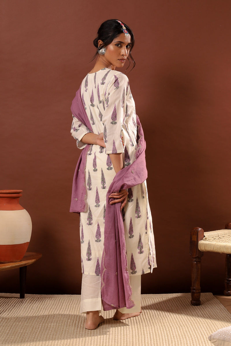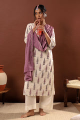 Lilac Floral Suit Set, with Off-white Pants and Kota Doria Dupatta