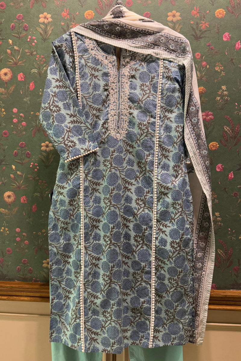 Sky Blue Floral Cotton Suit Set, with Pants and Kota Doria DupattaFABRIC