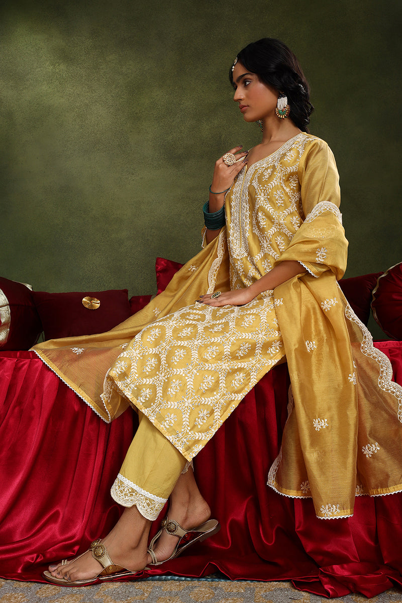 Subtle. Serene. Soulful. Our Ziya Yellow Chanderi Suit Set is a poetic blend of elegance and understated glamour. With delicately embroidered threadwork and a scalloped dupatta, it’s a piece that whispers timeless beauty. Perfect for golden-hour gatherings or festive mornings.