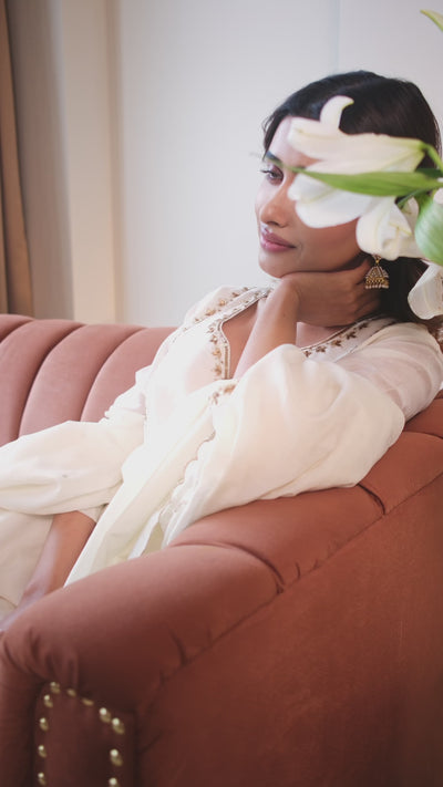 A timeless blend of elegance and grace, this ivory mul Chanderi suit set is a celebration of understated beauty. The kurta features a scalloped neckline delicately embroidered with equine work, lending a soft festive shimmer. Paired with straight-cut cotton pants and a matching dupatta adorned with subtle thread and sequin detailing, this ensemble is perfect for intimate gatherings, festive brunches, or serene celebrations.