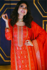 Red Dola Jacquard Straight Fit Suit Set | HER-336